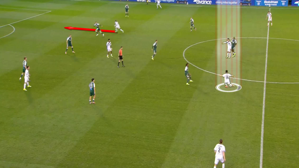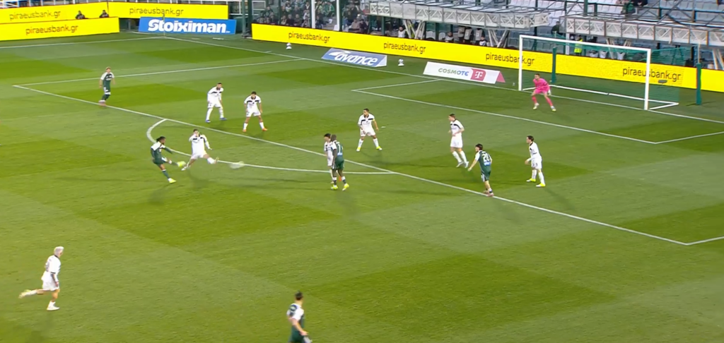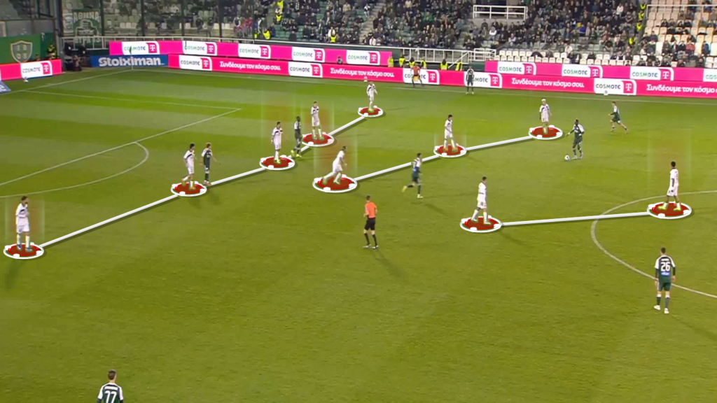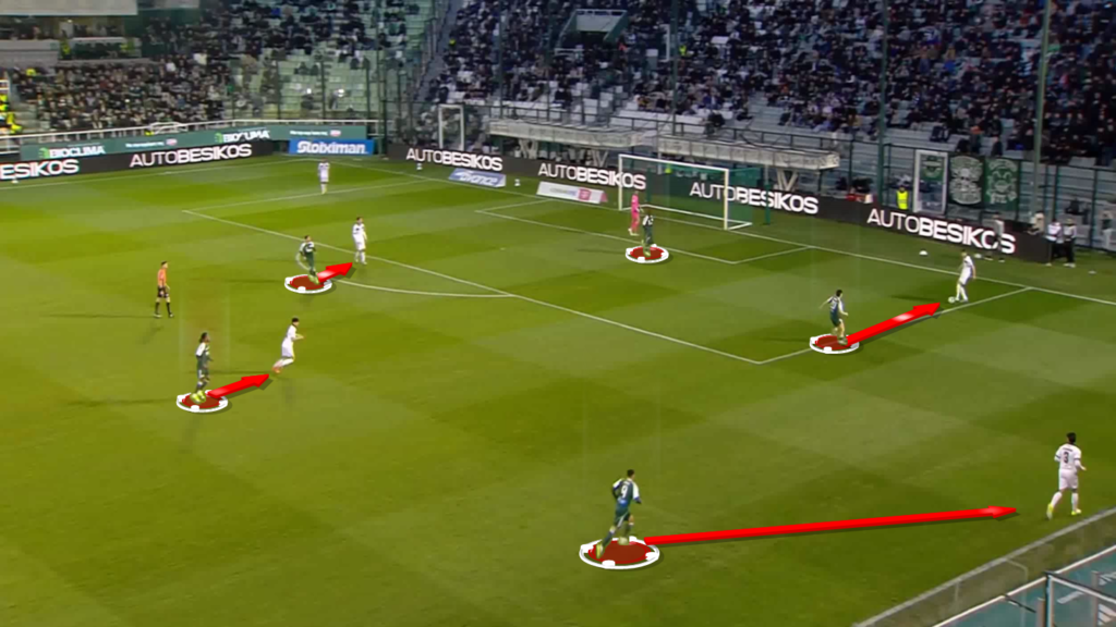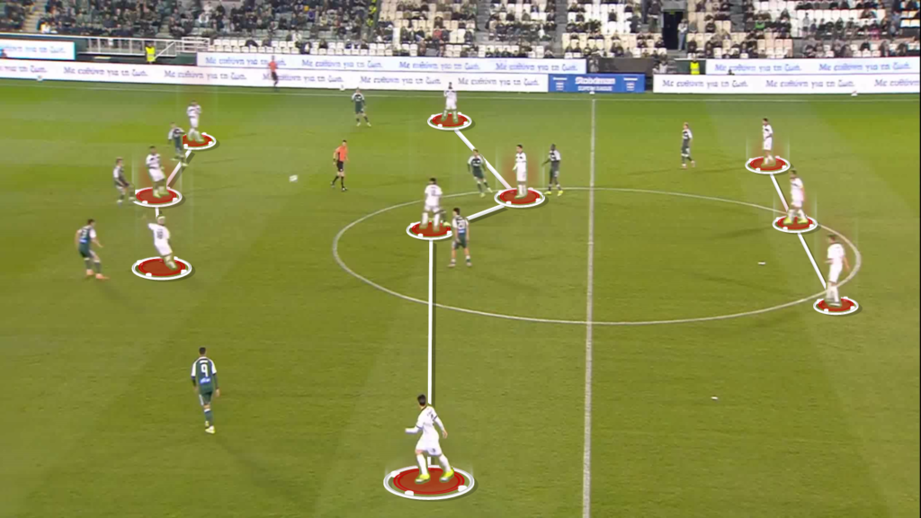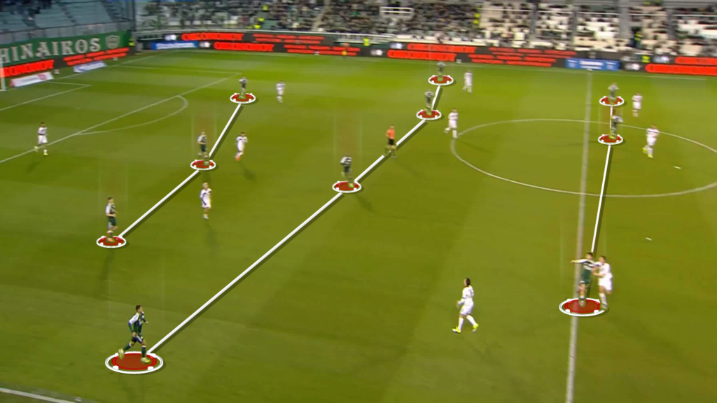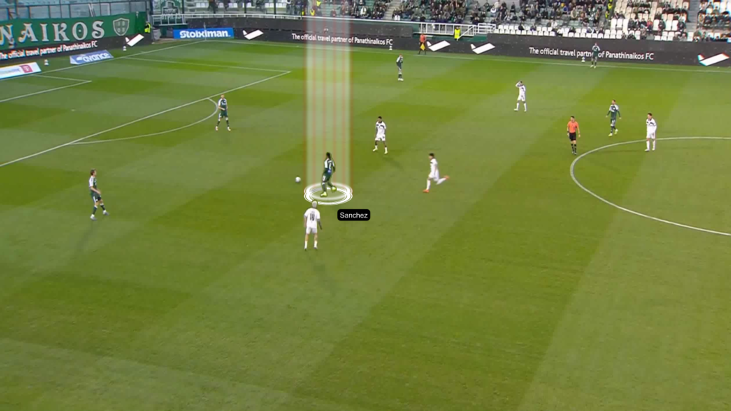Το build up του Παναθηναϊκού παρέμεινε στην ίδια λογική με το ματς με τον Άρη με τον Sanchez αυτή την φορά να χαμηλώνει στον σχηματισμό για να παίρνει την πρώτη πάσα από την άμυνα και να οργανώνει παιχνίδι.