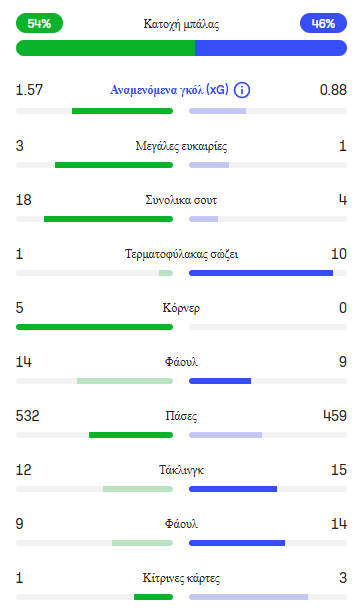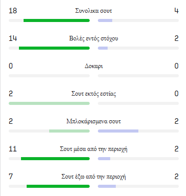 Φαίνεται από τα βασικά στατιστικά ότι ο Παναθηναϊκός κυριάρχισε στο ματς με μεγάλη διαφορά σε συνολικά σουτ και σε αυτά που ήταν εντός στόχου, καθώς από τα 14 εντός ο τερματοφύλακας του ΟΦΗ κατάφερε να αποκρούσει τα 10. Ο ΟΦΗ με μόνο 4 σουτ σύνολο και τα μισά από αυτά εντός στόχου δεν θα μπορούσε να διεκδικήσει πολλά από τον αγώνα.
