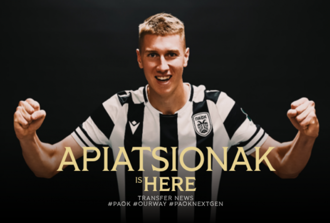 «Με το βλέμμα στο μέλλον. Η ΠΑΕ ΠΑΟΚ ανακοινώνει την απόκτηση του Λευκορώσου αμυντικού Πάβελ Απιατσιόνακ από τη Ντιναμό Μινσκ. Ο Απιατσιόνακ υπέγραψε συμβόλαιο συνεργασίας με τον Δικέφαλο για τα επόμενα τέσσερα χρόνια και θα φοράει την φανέλα με τον αριθμό 15.