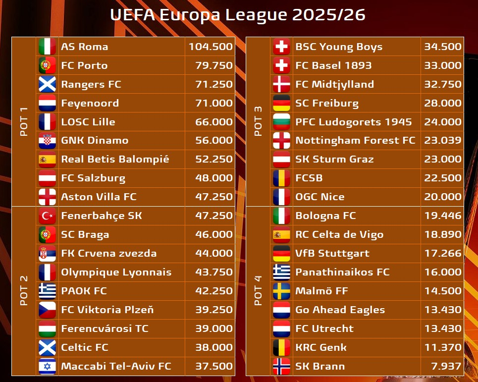 Η διαδικασία του Europa League ξεκινά στις 14:00 (COSMOTE SPORT 1 HD), με τον ΠΑΟΚ να τοποθετείται στο 2ο γκρουπ δυναμικότητας και τον Παναθηναϊκό στο 4ο. Κάθε ομάδα θα δώσει 8 παιχνίδια (4 εντός, 4 εκτός), αντιμετωπίζοντας αντιπάλους από όλα τα γκρουπ. Σημειώνεται ότι δεν μπορούν να κληρωθούν πάνω από δύο ομάδες από την ίδια χώρα.