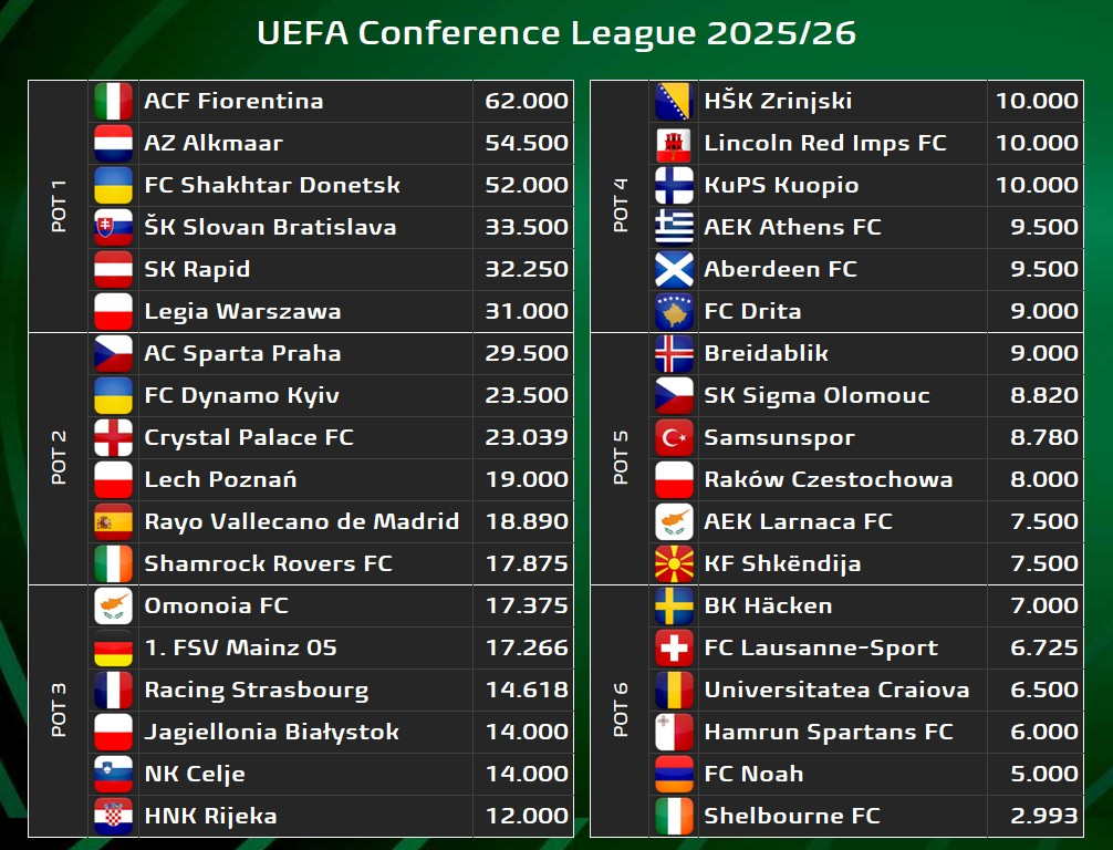 Αντίστοιχα, στις 15:30 (COSMOTE SPORT 1 HD) θα διεξαχθεί η κλήρωση του Conference League, όπου η ΑΕΚ βρίσκεται στο 4ο γκρουπ δυναμικότητας. Στη συγκεκριμένη διοργάνωση υπάρχουν έξι γκρουπ, με κάθε ομάδα να κληρώνεται με έναν αντίπαλο από το καθένα.