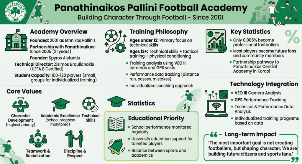 Η σχολή ποδοσφαίρου του Παναθηναϊκού στην Παλλήνη ή αλλιώς Εθνικός Παλλήνης, αποτελεί εδώ και περισσότερες από δύο δεκαετίες ένα σταθερό σημείο αναφοράς στην ανάπτυξη νεαρών ποδοσφαιριστών, καθώς ο Εθνικός Παλλήνης λειτουργεί από το 2000–2001 και από το 2005 βρίσκεται σε συνεργασία με τον Παναθηναϊκό, αποτελώντας επίσημα μέρος της σχολής ποδοσφαίρου του συλλόγου.