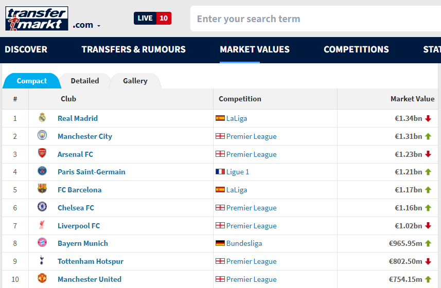 Στην κορυφή της λίστας βρίσκεται η Ρεάλ Μαδρίτης με 1,34 δισεκατομμύρια ευρώ ενώ την τριάδα συμπληρώνουν οι Μάντσεστερ Σίτι και η Άρσεναλ.