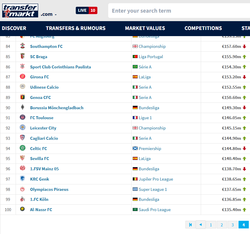Συγκεκριμένα το Transfermarkt κατατάσσει την ερυθρόλευκη ΠΑΕ στην 98η θέση καθώς την κοστολογεί στα 137,65 εκατομμύρια ευρώ.