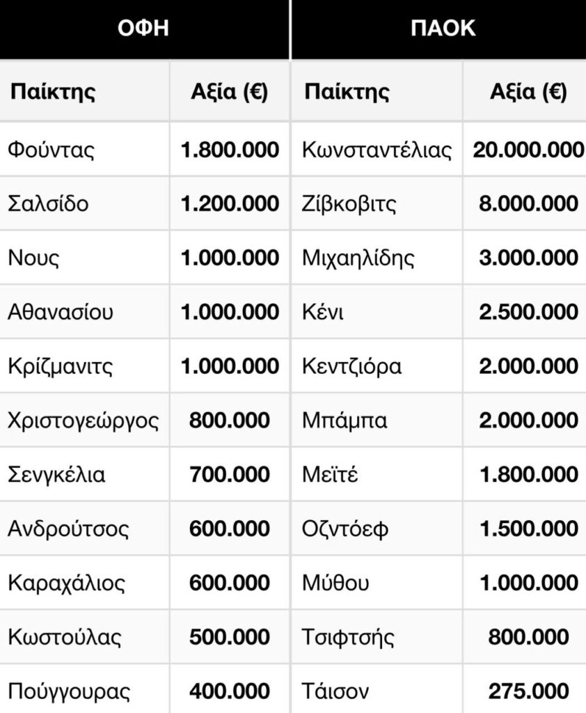 Την ίδια ώρα, ο Γιάννης Κωνσταντέλιας του ΠΑΟΚ, του οποίου η χρηματιστηριακή αξία φτάνει τα 20 εκατομμύρια ευρώ, αποτιμάται σε ποσό υπερδιπλάσιο σε σχέση με ολόκληρη την αρχική ενδεκάδα του ΟΦΗ στον τελικό του Πανθεσσαλικού. Αν μάλιστα συνυπολογιστεί και ο Αντρίγια Ζίβκοβιτς, με χρηματιστηριακή αξία που φτάνει τα 8 εκατομμύρια ευρώ και αποτελεί τον δεύτερο πιο «ακριβό» παίκτη του ΠΑΟΚ στον τελικό του Λουτσέσκου, η ψαλίδα ανάμεσα στους δύο φιναλίστ μεγαλώνει ακόμη περισσότερο.