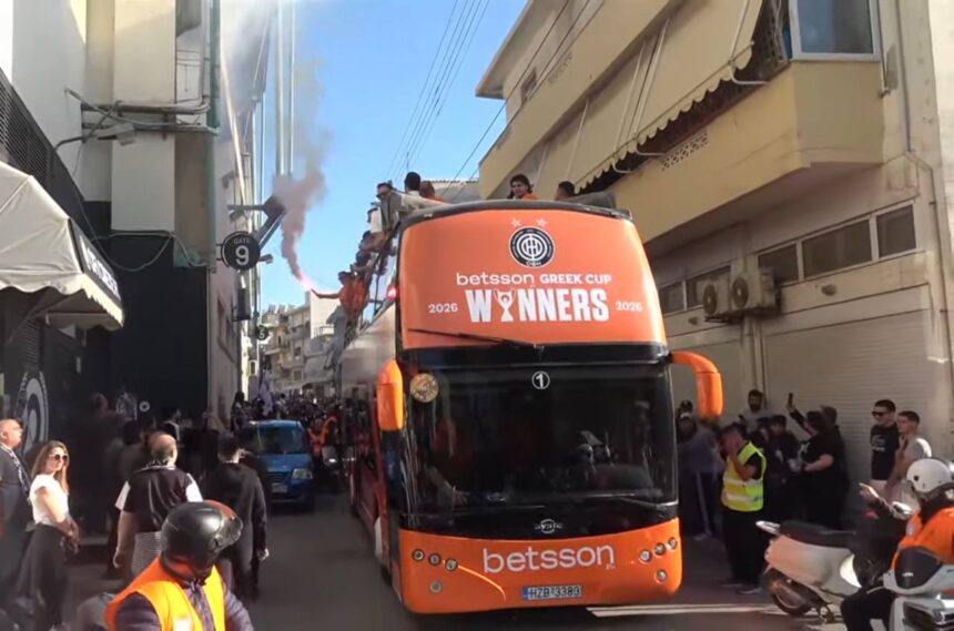 Ξέφρενοι πανηγυρισμοί στο Ηράκλειο για την κατάκτηση του Κυπέλλου Ελλάδας, με την αποθέωση να ξεκινά από το “Γεντί Κουλέ” και το ανοιχτό πούλμαν να διασχίζει την πόλη μέχρι το κέντρο, όπου οι παίκτες γίνονται αντικείμενο λαϊκής αποθέωσης από τον κόσμο στους δρόμους.