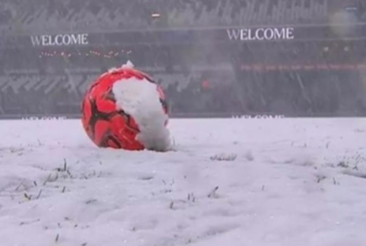 Βίντεο και φωτογραφίες που αναρτήθηκαν στα social media δείχνουν οπαδούς και υπαλλήλους του γηπέδου να συνεργάζονται, καθαρίζοντας από κοινού τον αγωνιστικό χώρο από το χιόνι.