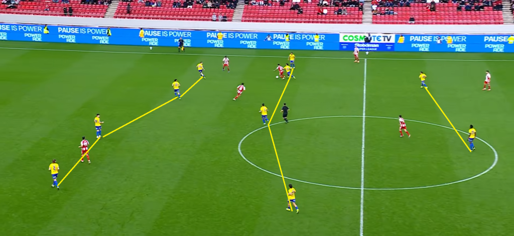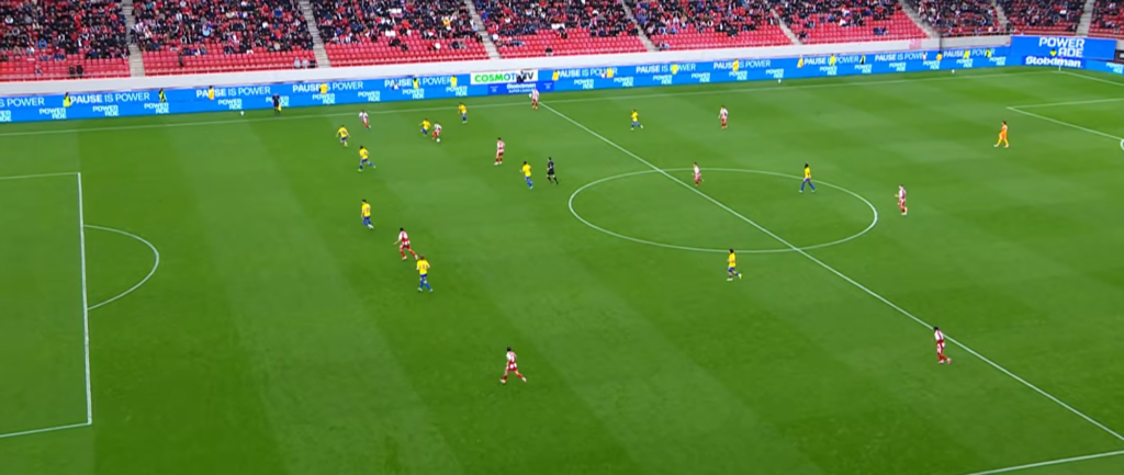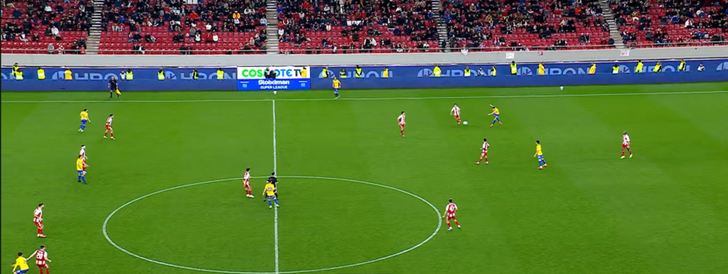 Και οι δύο ομάδες παρατάχθηκαν με 4-2-3-1 σαν αρχικό σχηματισμό με τον Παναιτωλικό να γυρίζει στο 4-4-2 σε φάση άμυνας και να περιμένει τον Ολυμπιακό σε ένα Mid Block με την αμυντική του γραμμή ανεβασμένη ψηλά όπως θα δούμε στο παρακάτω στιγμιότυπο.