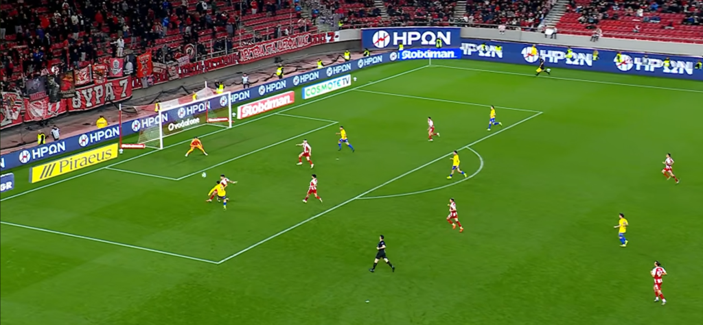 Ακριβώς για αυτό τον λόγο ο Παναιτωλικός πήγε να εκμεταλλευτεί τα ανεβάσματα του Κοστίνια και άρα την αδυναμία στο δεξί άκρο της άμυνας του Ολυμπιακού όποτε το περισσότερο παιχνίδι από τον Αναστασίου ήταν στα αριστερά του Παναιτωλικού και κυρίως με μακρινές μπαλιές στην πλάτη της άμυνας αμέσως μετά την ανάκτηση όπως είδαμε και στο στιγμιότυπο λίγο νωρίτερα
