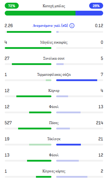 Όπως φάνηκε ο Ολυμπιακός είχε την κατοχή και τον έλεγχο του αγώνα και ειδικά μετά το 1-0 που ο Παναιτωλικός αναγκάστηκε να ανέβει σιγά σιγά πιο ψηλά για να ψάξει την ισοφάριση είχε καλύτερη κυκλοφορία της μπάλας και περισσότερη ψυχραιμία που τον βοήθησε στη δημιουργία ευκαιριών για να σκοράρει. Αυτό φαίνεται από τα στατιστικά του αγώνα με τον Ολυμπιακό να έχει 72% κατοχή έναντι 28% του Παναιτωλικού και το xG (αναμενόμενα γκολ βάση ποιότητας ευκαιριών) να είναι στο 2,26 έναντι 0,16 του Παναιτωλικού.