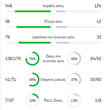 Όπως φαίνεται οι εσωτερικές κινήσεις του Νασιμέντο από το αριστερό άκρο και ο ελεύθερος ρόλος του Τσικίνιο βοήθησαν τον Ολυμπιακό να έχει την υπεροχή και την κατοχή της μπάλας με ποσοστό στις πάσες 76%. Ο Παναιτωλικός αντίθετα, λόγω και του τρόπου του παιχνιδιού του (άμεση μετάβαση της μπάλας από την άμυνα στην επίθεση) είχε χαμηλό ποσοστό επιτυχημένων πασών 46% στο τελευταίο τρίτο και ακριβείς πάσες 124 από τις 214 συνολικά.