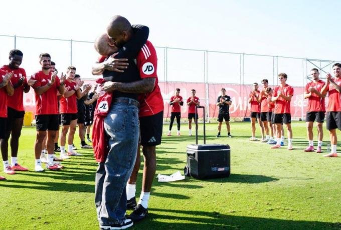 Οι συμπαίκτες του, ο Ματίας Αλμέιδα και το επιτελείο του υποδέχθηκαν με ένα «θερμό» χειροκρότημα την νικήτρια της ζωής, Πάμελα και της χάρισαν μια φανέλα με το νούμερο «8». Η συγκίνηση ήταν τεράστια με τον κεντρικό αμυντικό να την αγκαλιάζει με δάκρυα στα μάτια.