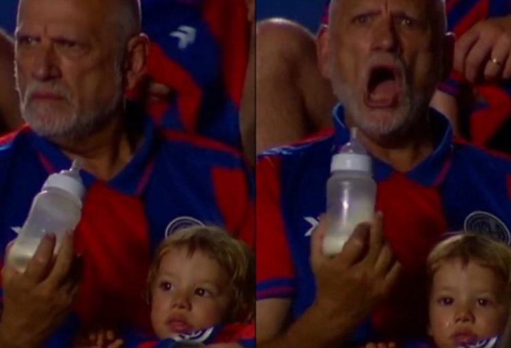 Η τηλεοπτική κάμερα κατέγραψε έναν οπαδό της ομάδας, πιθανώς παππού, να κρατά στην αγκαλιά του το εγγονάκι του και να προσπαθεί να το ταΐσει με το μπιμπερό. Ο μικρός όμως είχε… άλλες προτεραιότητες, δείχνοντας ξεκάθαρα πως δεν ήθελε να συνεργαστεί, ενώ ο παππούς παρακολουθούσε έντονα την εξέλιξη του αγώνα.