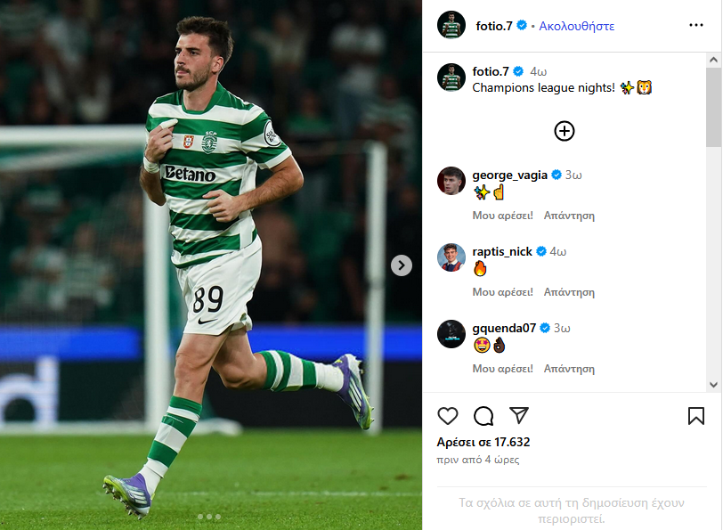 Ιστορική βραδιά ήταν η χθεσινή (18/9) για τον Φώτη Ιωαννίδη, ο οποίος έκανε το ντεμπούτο του στο Champions League με τη φανέλα της Σπόρτινγκ Λισαβόνας και το γιόρτασε με ανάρτηση στα social media.